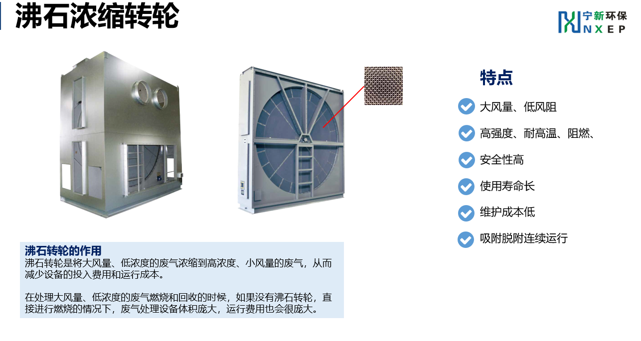 • 沸石转轮吸附VOCs所产生的压降极低,可大大减少电力能耗;